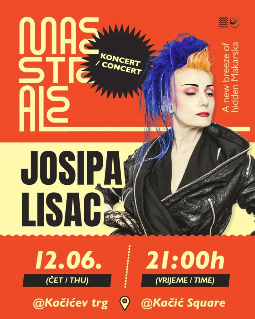 U četvrtak, 12. lipnja, na Kačićevu trgu očekuje vas nezaboravna večer uz bezvremenske hitove Josipe Lisac. Ovim koncertom otvaramo novo poglavlje Maestralea, makarskog kulturnog ljetnog osvježenja koje je postalo lijepa tradicija. Pod zvjezdanim nebom, zajedno ćemo stvoriti prve uspomene ovogodišnjeg izdanja Maestrale – novog vjetra skrivene Makarske.